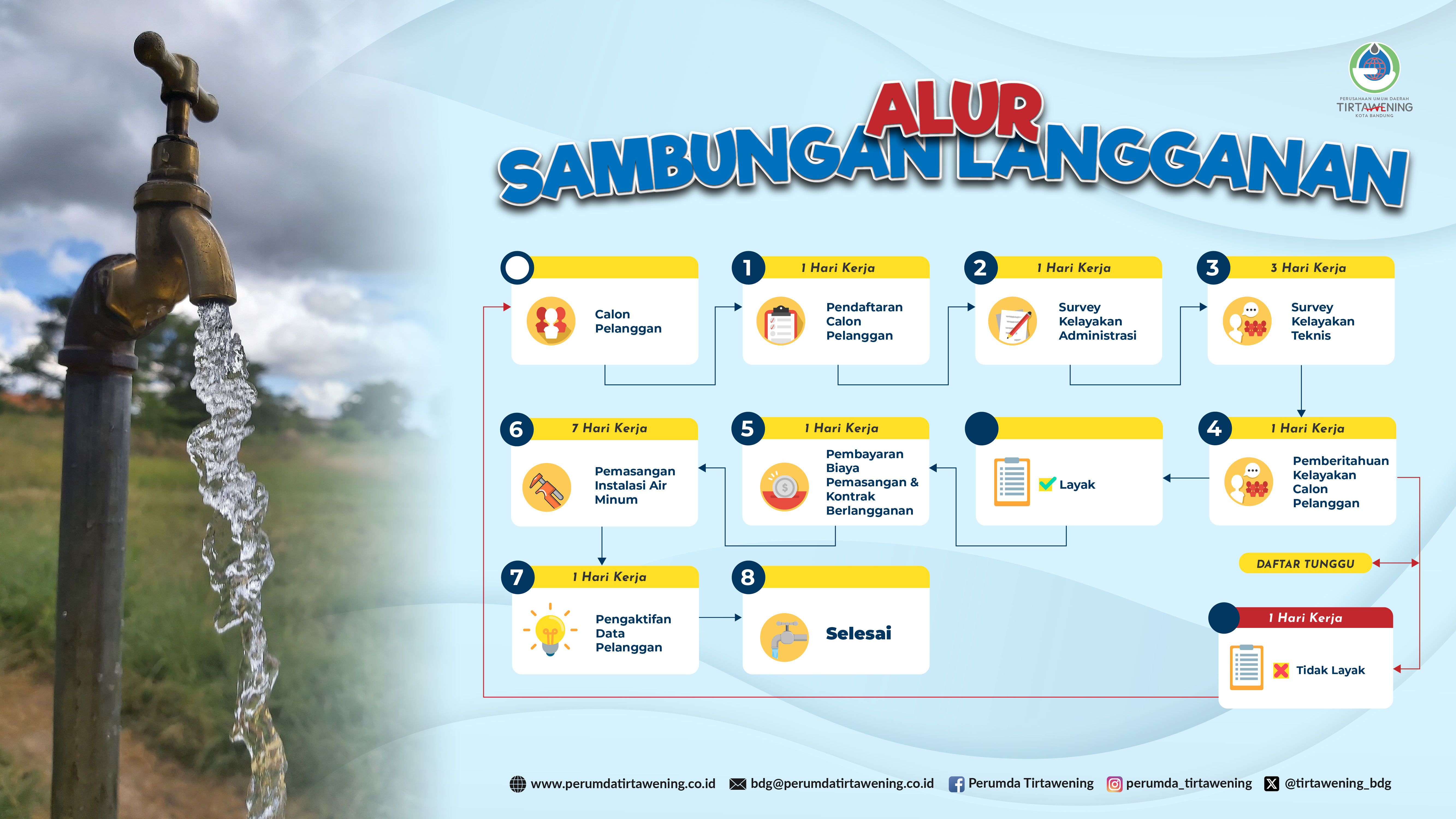 Para calon pelanggan Perumda Tirtawening Kota Bandung yang tercinta, untuk mengajukan Permohonan Pemasangan Saluran Air Minum dapat melihat diagram alur sambungan langganan sebagai berikut: