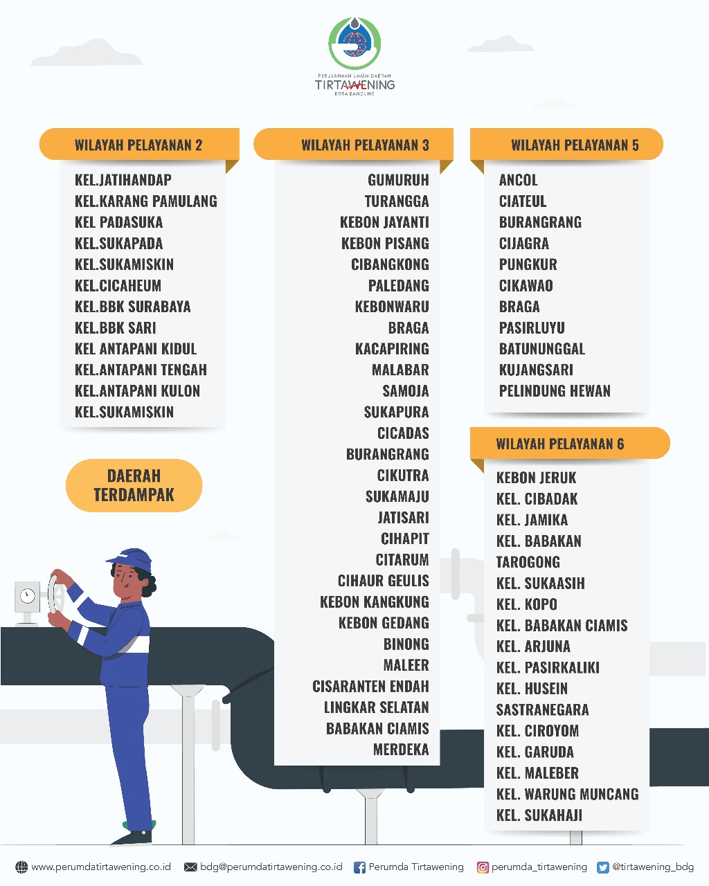 Berikut kami informasikan untuk Wilayah Pelayanan yang terkena dampak dan nomor kontak yang dapat dihubungi lebih lanjut :