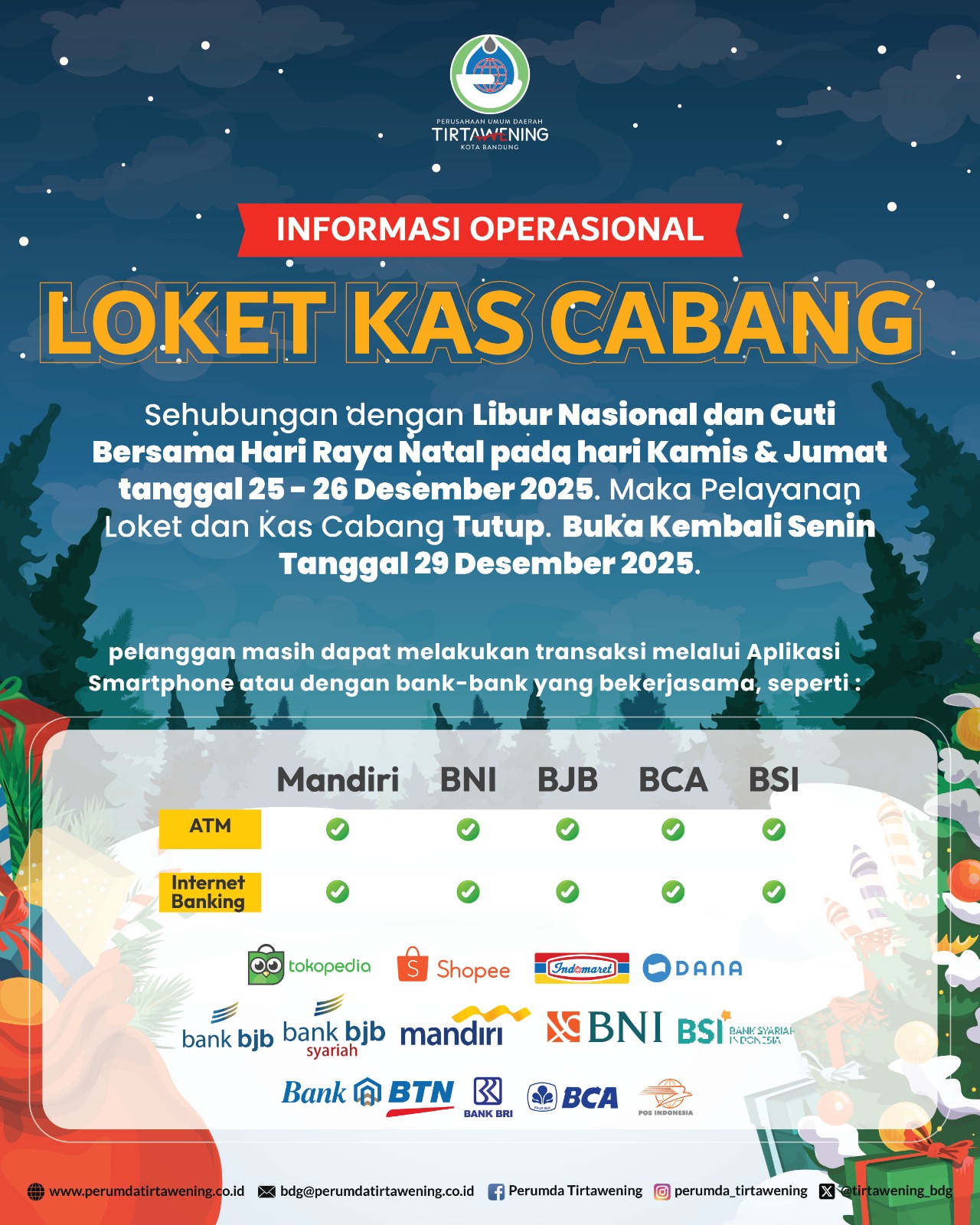 Sehubungan dengan Hari Libur Nasional dan Cuti Bersama Hari Raya Natal, Loket dan kas cabang Perumda Tirtawening tidak beroperasi pada hari Kamis & Jum’at tanggal 25 s/d 26 Desember 2025.