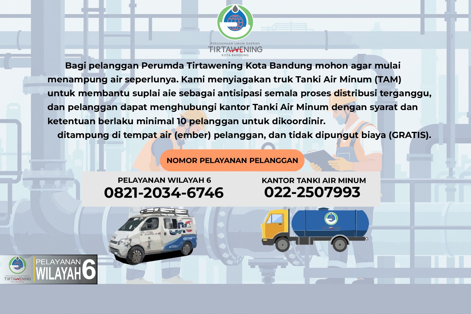 Kami mengimbau pelanggan untuk menampung air secukupnya dan menggunakan air secara bijak selama pekerjaan berlangsung. Sebagai langkah antisipasi, layanan Pelayanan Non Perpipaan (PNP) disiagakan. Permohonan dapat diajukan melalui koordinator wilayah (minimal 10 pelanggan).