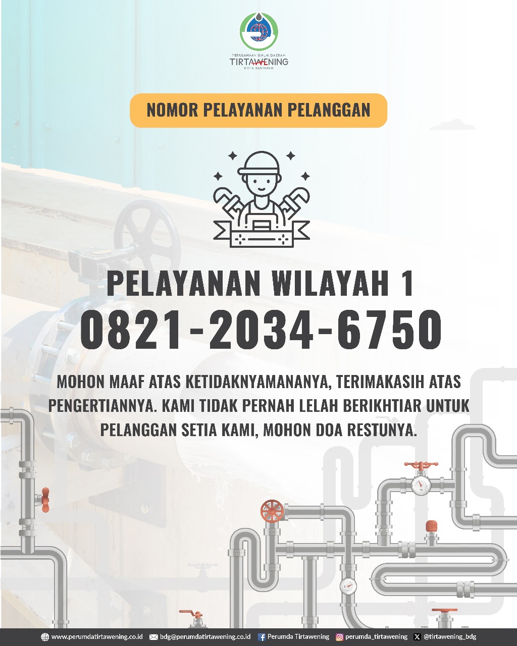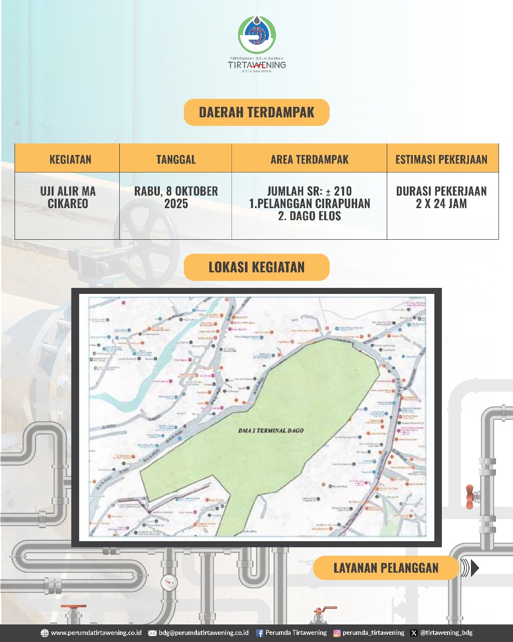 Kami memohon maaf atas ketidaknyamanan yang mungkin dirasakan selama proses pekerjaan berlangsung. Semoga kegiatan ini dapat meningkatkan kualitas layanan air bersih untuk seluruh masyarakat Bandung, khususnya wilayah utara.
