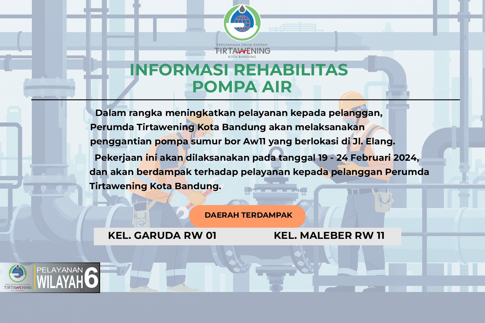 Dalam upaya meningkatkan kualitas pelayanan, kami informasikan bahwa akan di laksanakan Pengerukan sungai Intake Bantar Awi dan Pengurusan Koagulan IPA Dago Pakar
