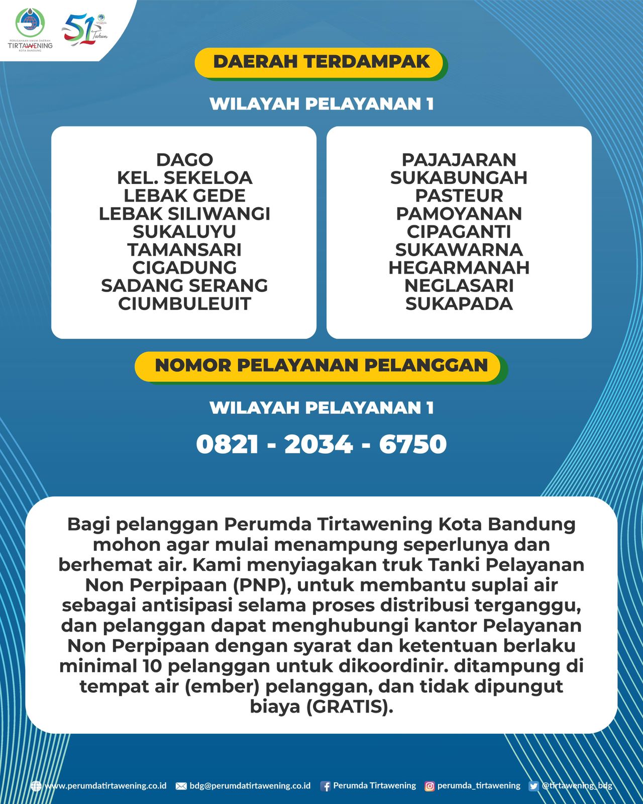 Kami mengimbau pelanggan untuk menampung air seperlunya dan menggunakan air secara hemat.