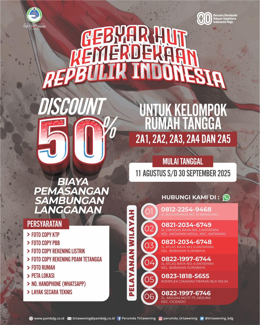 Rayakan semangat kemerdekaan bersama Perumda Tirtawening! 💧 Dapatkan DISKON 50% biaya pemasangan sambungan langganan khusus untuk kelompok Rumah Tangga (2A1, 2A2, 2A3, 2A4, dan 2A5) 🎉
