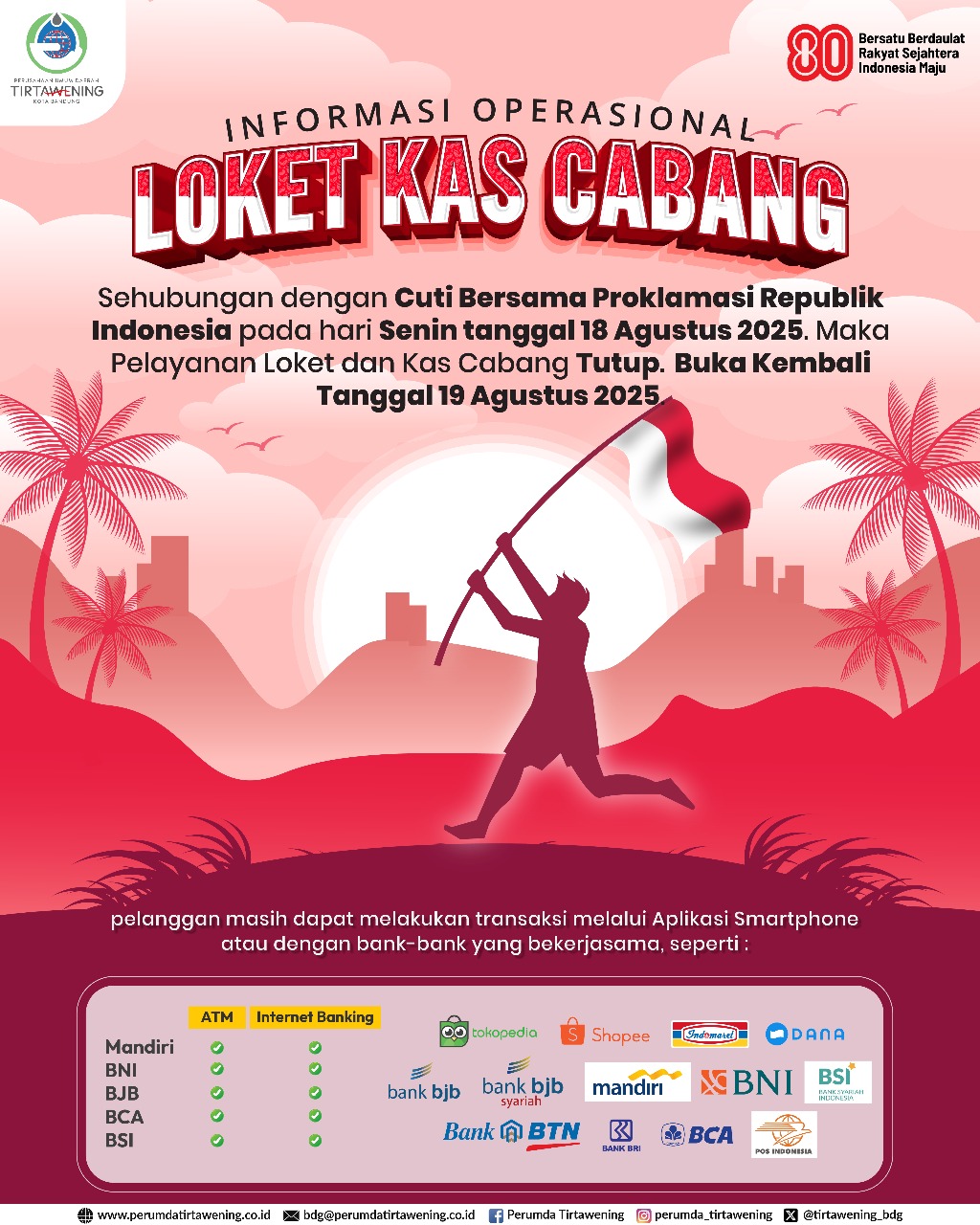 Sehubungan dengan adanya Cuti Bersama Proklamasi Kemerdekaan Republik Indonesia pada tanggal 18 Agustus 2025 pelayanan loket pembayaran tidak beroperasi, kecuali via online