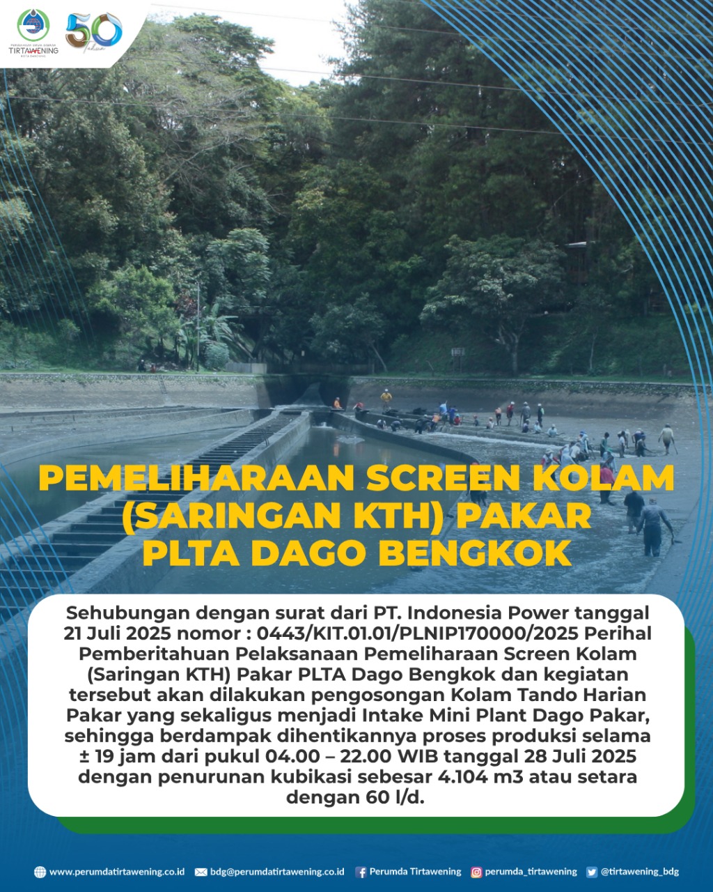 Dalam upaya memaksimalkan pelayanan pada pelanggan berikut kami informasikan jadwal Pemeliharaan Screen Kolam (Saringan KTH) PLT Dago Bengkok