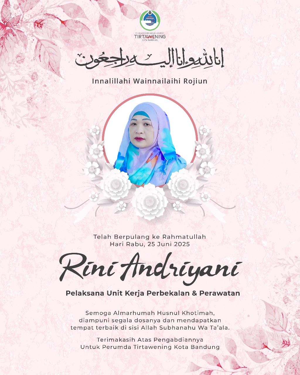 Kami segenap keluarga besar Perumda Tirtawening Kota Bandung turut berbelasungkawa atas meninggalnya almarhumah Ibu Rini Andriyani