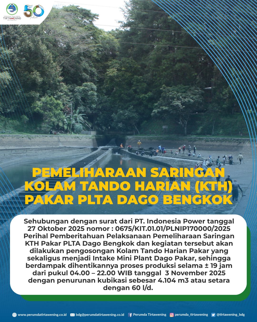 Dalam upaya memaksimalkan pelayanan pada pelanggan berikut kami informasikan jadwal Pemeliharaan Screen Kolam (Saringan KTH) PLT Dago Bengkok.