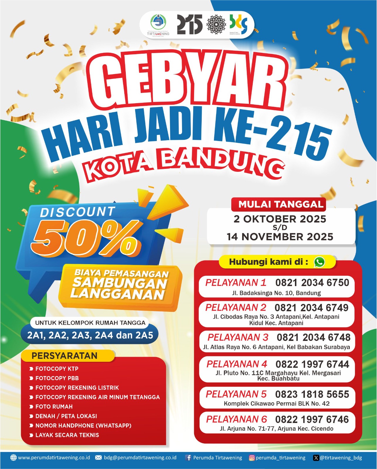 Dalam rangka memeriahkan Hari Jadi ke-215 Kota Bandung, Perumda Tirtawening Kota Bandung menghadirkan promo spesial untuk masyarakat Kota Bandung tercinta!🥳